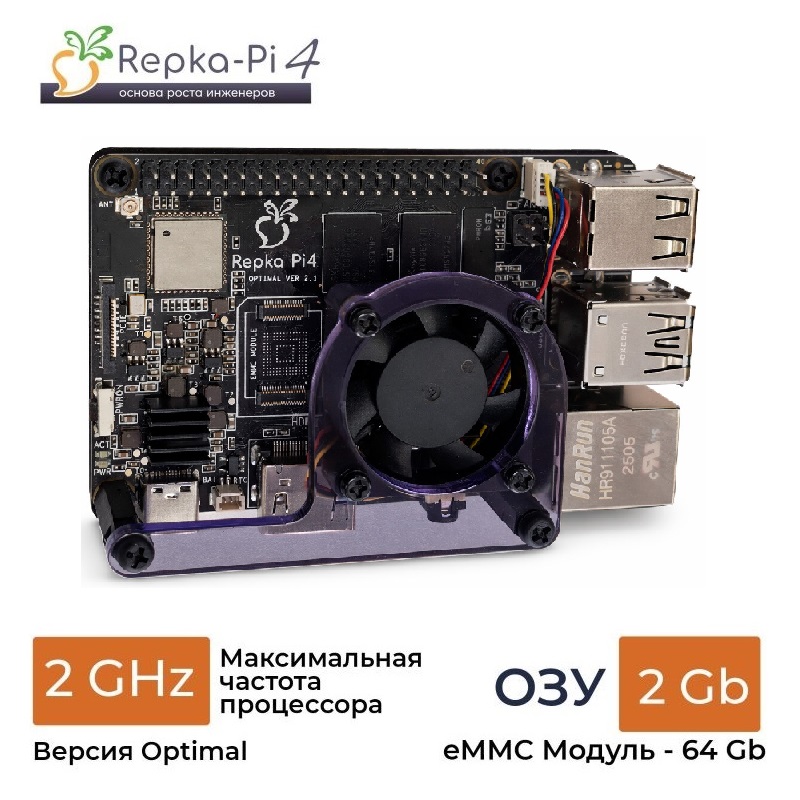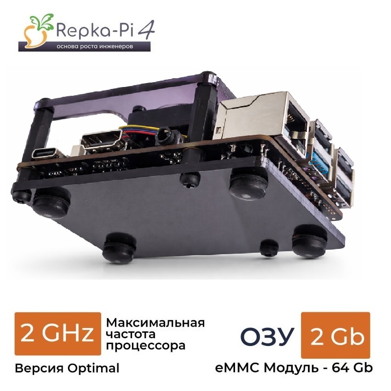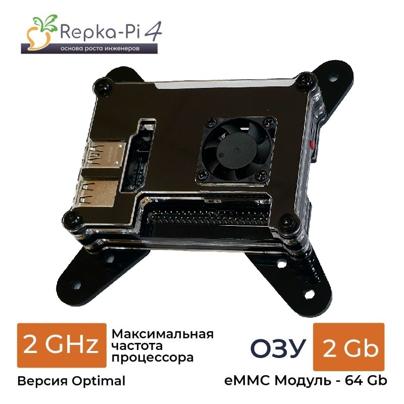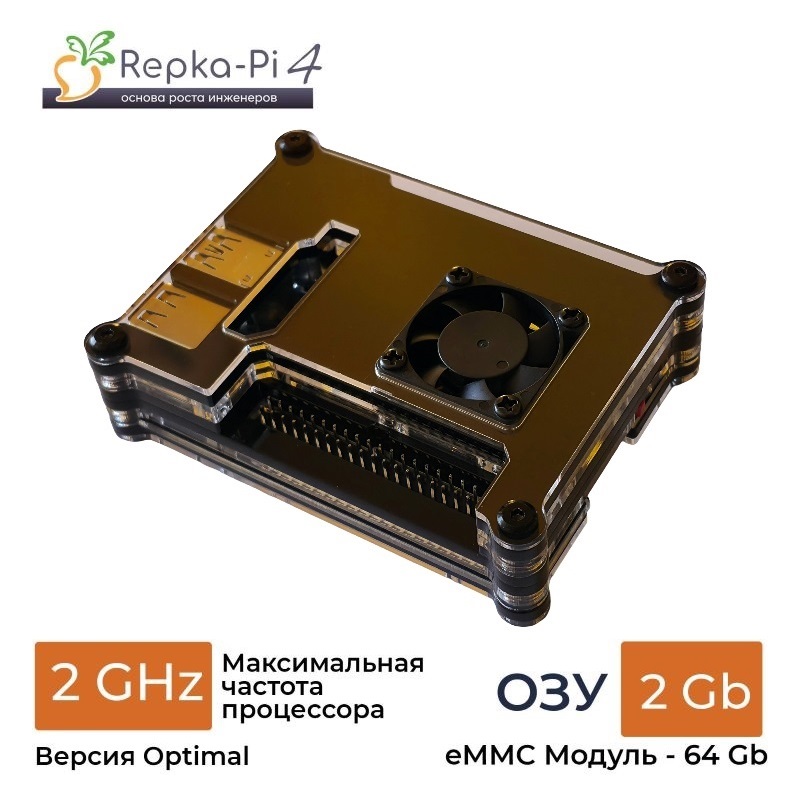 Для Repka Pi 4 дополнительно разработан более бюджетный вариант корпуса, предусматривающий только установку компьютера на столе, но при этом, обеспечивающего эффективное охлаждение встроенным управляемым вентилятором. Кроме того, такой вариант корпуса обеспечивает открытый доступ ко всем разъёмам платы.